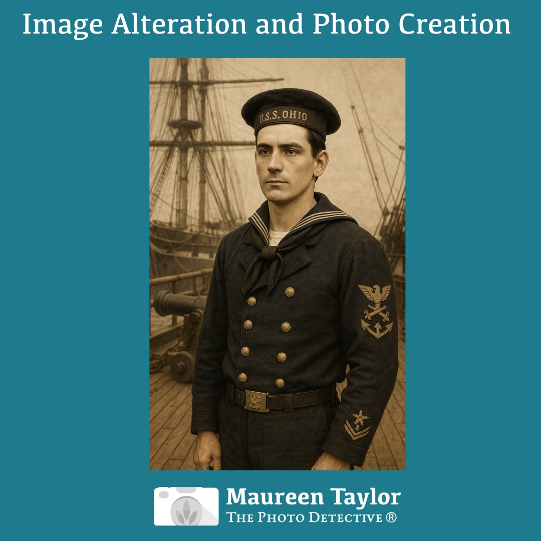 Periodically, I check into ChatGPT and try to enhance or generate an image. The cover image includes details I provided about my 2x great-grandfather, James Wilson, regarding his Civil War service and the ships he served on. For image reference, I uploaded an image of his son. I don’t have a photo of James.
